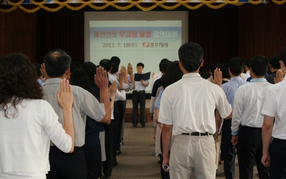 한편, 한전 경주지사는 지난 7월 18일(수)에 허태요 지사장과 정상호 노조위원장은 직접 선서를 하면서, 경주지사 전 직원이 매일 배전선로 순시 등 적극적인 고장예방활동으로 한 건의 고장 없이 여름철 안정적인 전력공급을 위해 배선선로 무고장 달성 결의대회를 실시했다.