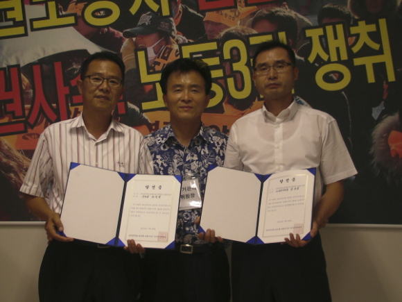 |  | | | ↑↑ 왼쪽부터 유욱재(지부장), 한현식(전국공무원노동조합포항시지부 선거관리위원장, 강호경(수석부지부장) | | ⓒ GBN 경북방송 | | |
