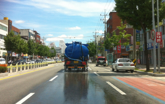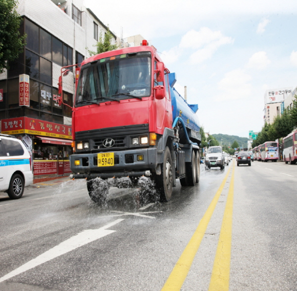 폭염기승, 도로변 살수차량 동원 기온낮추기 안감힘