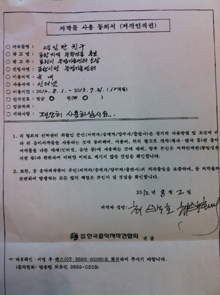 하지만 최백호씨가 포항시 농·식품유통과로 보내온 저작물 사용 동의서에는 “편안히 사용하십시오”라는 글귀와 함께 지불할 인격권료가 0원으로 작성된 것.