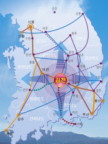 특히, KTX김천(구미)역 개통과 더불어 2016년 김천~진주 간 남부내륙철도 건설 확정, 김천~전주 간 동서횡단철도 사업이 예정되면서 물류 중심도시로 성장하고 있고 김천혁신도시 조성과 함께 혁신도시 내 산·학·연 클러스터 개발은 기업유치에 큰 호재로 작용하고 있다.