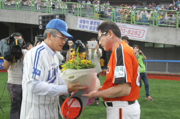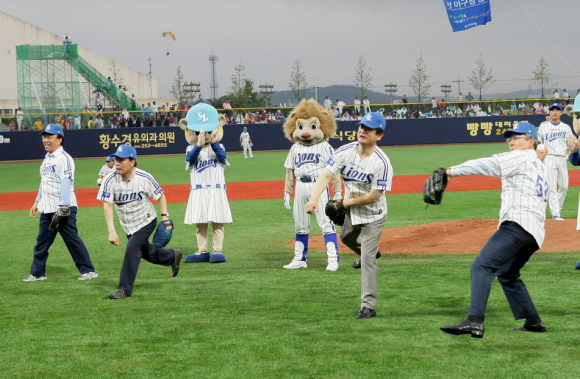 포항야구장의 공식 첫 프로야구경기에 앞서서 박승호 포항시장은 이날 경기를 펼치는 류중일 삼성라이온즈 감독과 한대화 한화이글스 감독에게 꽃다발을 전달했으며, 박승호 포항시장과 이병석 국회부의장, 이칠구 포항시의회의장, 김관용 경상북도지사는 4명의 포수가 대기한 가운데 동시시구를 펼쳐 큰 박수를 받았다.