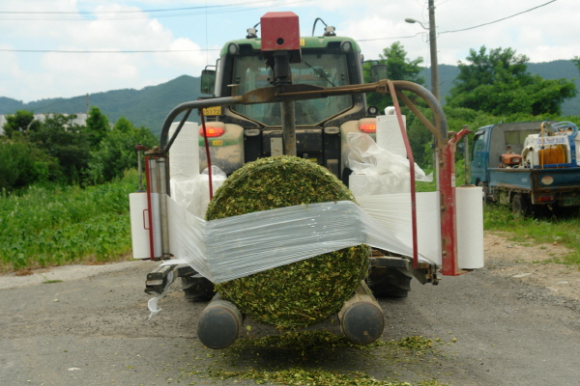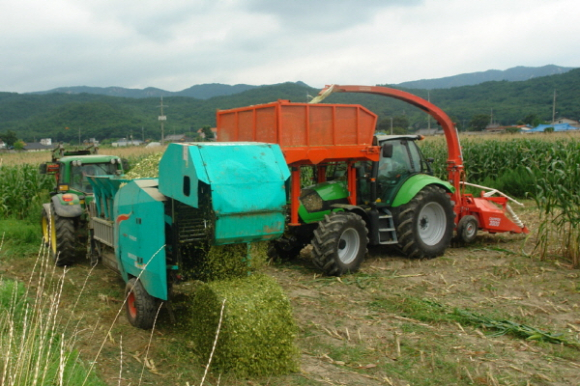사료용 옥수수는 하베스타 수확과 동시에 옥수수 전용 원형베일러와 랩핑기를 이용, 곤포 랩 사일리지(둥글게 말아 랩으로 피복하여 발효시킨 담근먹이 조사료)로 만들어 소에게 급여한다.