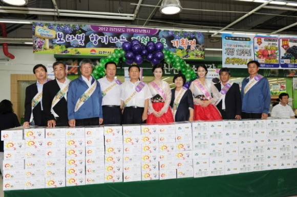 김천시(시장 박보생)에서는 21일(화), 김천포도 특별기획행사로 농협 하나로클럽 서울 양재점과 성남점에서 대대적인 판촉활동을 가졌다.