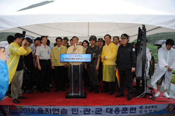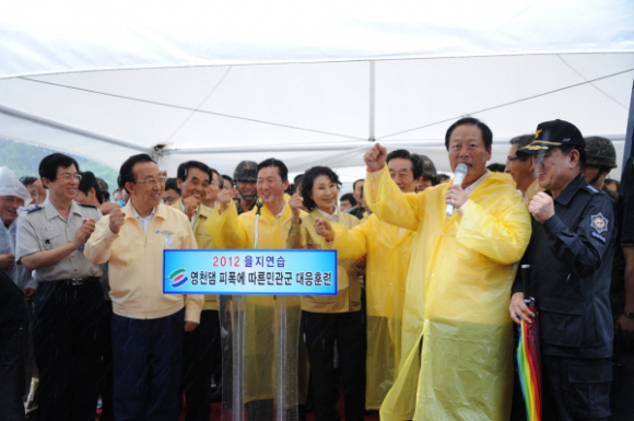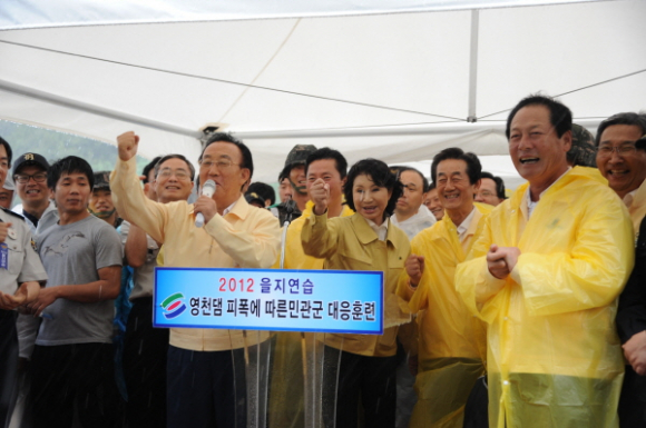 영천시(시장 김영석)에서는 지역통합방위 및 국가비상사태 대응태세를 확립하기 위하여 22일 오후 2시에 임고면 삼매리 영천댐 일원에서 김관용 도지사, 정연봉 50사단장, 이만희 경찰청장을 비롯한 유관 기관단체장, 시민 등 1,500여명이 참여한 가운데 2012 을지연습 영천댐 피폭에 따른 민관군 대응훈련을 실시했다.