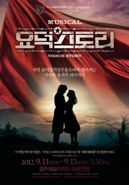 ❏ 공연개요 ❍ 공 연 명 : 뮤지컬「요덕스토리」 - 제 78회 국제펜(PEN)대회 공식 초청작 - ❍ 기 간 : 2012년 9월 11일(화) 19:30 (국제펜대회 초청일) 2012년 9월 12일(수), 13일(목) 19:30 ❍ 장 소 : 경주예술의전당 대공연장 ❍ 주 관 : (재)경주문화재단, (사)NK문화재단 ❍ 주 최 : 경북문화콘텐츠진흥원, (주)애즐글로웍스 ❍ 관 람 료 : R석 100,000원, S석 80,000원, A석 60,000원 ❍ 러닝타임 : 180분정도 ❍ 관람연령 : 만 7세 이상