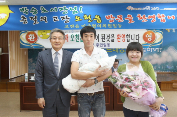 오천읍은 6일 오천읍사무소 회의실에서 포항시장의 민생현장 방문을 겸해 인구5만명 돌파 축하행사를 개최하고 5만번째 읍민이 된 고성민군의 가족을 축하했다.