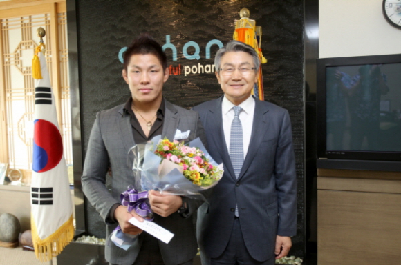 ‘한팔승의 사나이’ 런던 올림픽 남자유도 81kg급 금메달리스트 김재범(27. 한국마사회)이 유도계 대선배인 박승호 포항시장을 만났다.