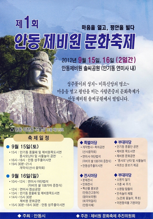 「제1회 안동제비원문화축제」가 9월 15일과 16일 이틀간의 일정으로 안동시 이천동 제비원 솔씨공원 일원에서 열린다.