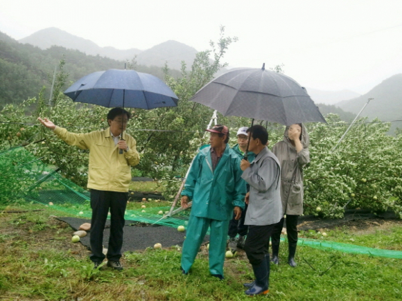 권영세 안동시장이 태풍 산바 피해를 입은 현장 점검에 나섰다. 권 시장은 17일 오전 강력한 돌풍으로 통신주가 넘어지고 사과나무 도복 및 낙과 등의 피해를 입은 도산면 단천리 일원을 찾았다.