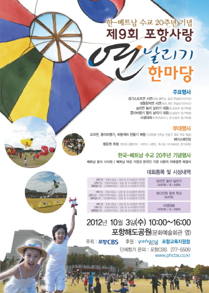 포항CBS와 포항시는 개천절인 오는 10월 3일 포항 해도공원(문예회관 옆)에서 ‘제9회 포항사랑 연날리기 한마당’을 개최한다.