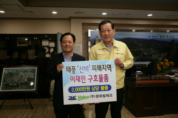 2012. 9. 26(수)일 평화발레오, (주)한국아스텔라스제약, 대구 달서구 바르게살기협의회, 초전면체육회·이장상록회는 성주군을 방문, 제16호 태풍 ‘산바’로 막대한 피해를 입은 이재민에게 전해 달라며 3,700만원 상당의 물품을 기탁했다.