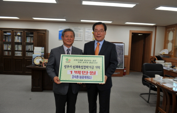 10월 8일 송광제재소 대표 강석춘씨는 영주시인재육성장학회를 방문하여 1백만원을 기탁하였다.