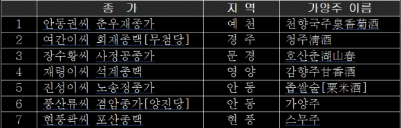 몇 백 년 동안 봉제사와 접빈객을 위해 주조되어 온 종가의 내림 가양주에 대해 종가별로 주조공법과 완성주를 소개․전시하고, 이를 통해 우수한 전통문화를 브랜드화 할 수 있는 방안을 모색한다. 가양주와 주안상 출품 종가는 아래와 같다.