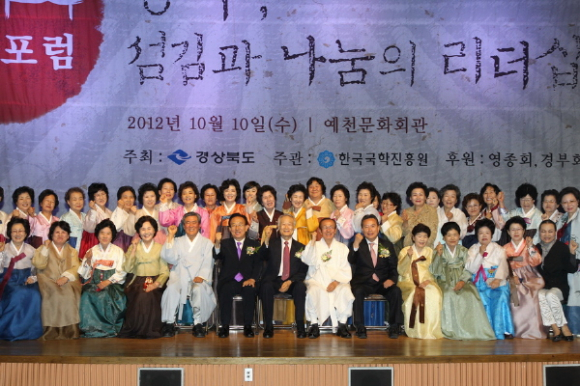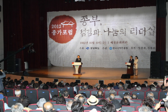 한국국학진흥원(원장 김병일)은 경상북도(지사 김관용)의 지원으로 10월 10일(수) 오후 2시 30분부터 6시까지 예천군문화회관에서 2012년도 종가포럼을 개최한다. 올해로 5회째를 맞는 이번 종가포럼의 주제는 “종부, 섬김과 나눔의 리더십”이다.
