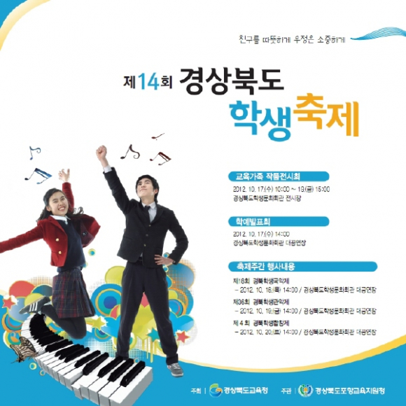 경상북도교육청 “교육감 이영우” 에서는 오는 10월 17일(목) 환태평양 시대를 열어갈 전진 기지 포항에서 “제14회 경상북도학생축제”를 경상북도학생문화회관에서 개최한다.