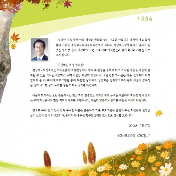 이영우 경상북도교육감은 “축제를 통하여 잠재 능력을 계발하고 무한한 창의력과 상상력을 발휘함으로써 문화 예술적 감수성을 길러 넉넉한 삶의 토대를 쌓는 기회로 삼고, ”친구를 따뜻하게, 우정은 소중하게“라는 주제 정신을 잘 살려 폭력 없는 행복한 학교가 될 수 있는 계기가 될 것이라고” 밝혔다. |