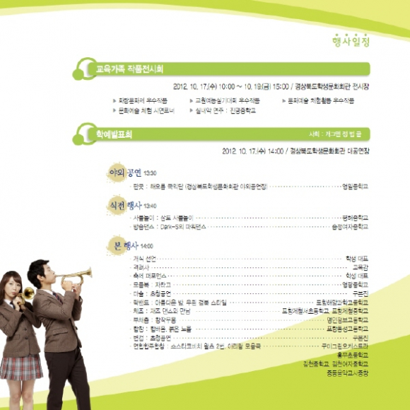 포항교육지원청 주관으로 거행되는 금년도 축제는 10월17일부터 10월20일까지 4일간 계속된다. 경상북도학생문화회관에서 17일 10시 “교육 가족 작품 전시회”를 시작으로 학예 발표 공연 행사가 성대하게 개최되고, 이어 18일~20일에는 경상북도학생문화회관에서 경북국악제, 경북관악제, 경북합창제가 차례로 이어진다.