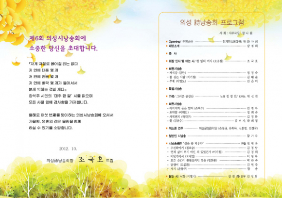 의성시낭송회 조국호 회장은 “지속적인 지역문화행사 및 자체 시낭송 행사를 통해 아름다운 시보급과 군민 정서 함양 및 지역문화발전에 일조를 하겠다”고 이번 행사의 소감을 밝혔다. |