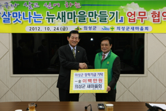 의성군새마을회에서는 10월 24일 회장 김수현을 비롯한 지회 회장단 4명이 의성군수실을 방문해 의성군 향토인재 육성을 위한 장학기금 200만원을 의성군장학회에 전달했다
