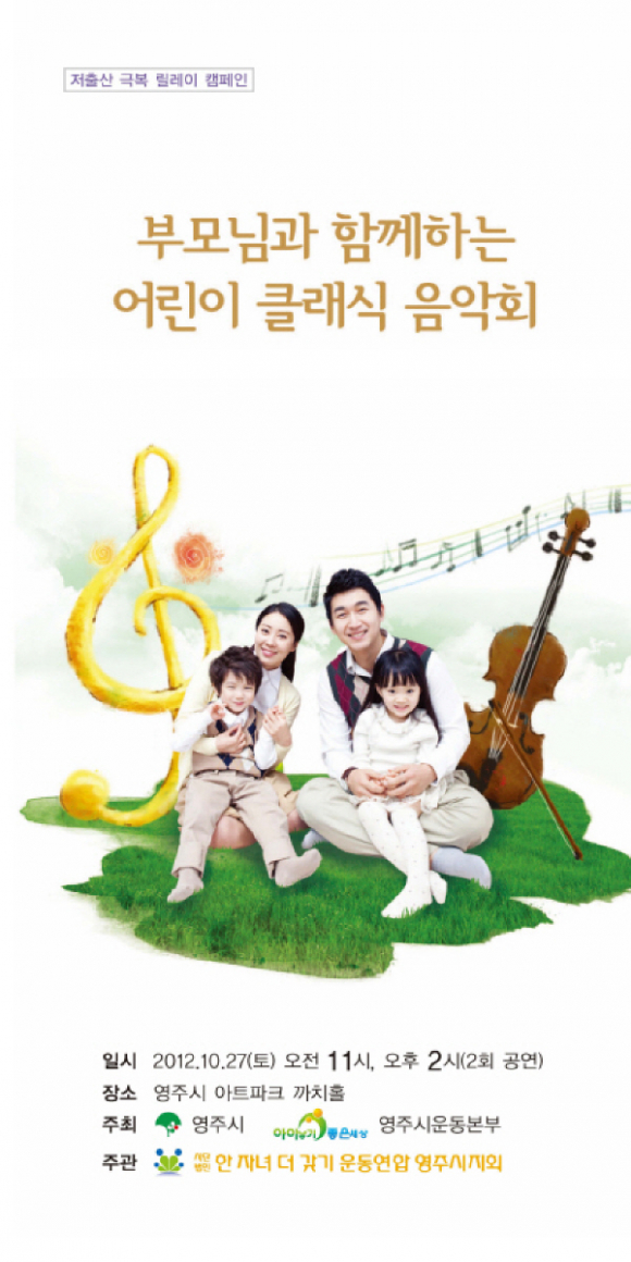 영주시보건소(소장 임무석)에서는 저출산 극복의 일환으로 사)한자녀 더갖기 운동연합 영주지회와 함께 부모와 함께하는 어린이 클래식 음악회를 개최한다.