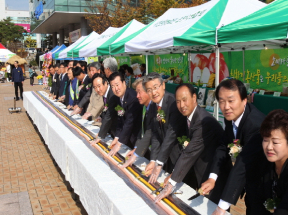 26일 포항시친환경농산물 품평회 및 홍보직판행사에 참가한 내빈들이 친환경 오색떡을 절단하고 있다.