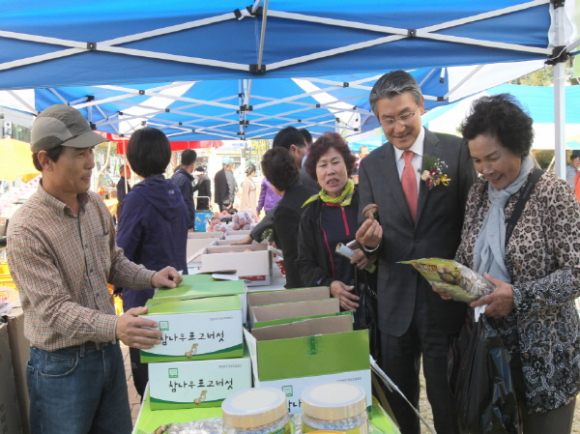 박승호시장이 26일 포항시친환경농산물 품평회 및 홍보직판행사에 선보인 친환경 참나무 표고버섯에 대해 설명을 듣고 있다. |