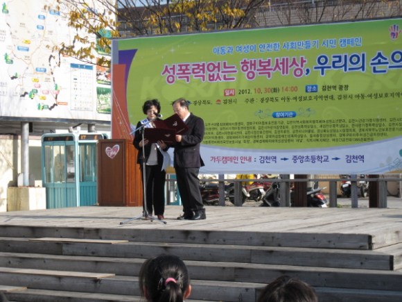 김천시(시장 박보생)는 최근 아동과 여성을 대상으로 하는 성폭력과 가정폭력이 사회적인 문제로 대두됨에 따라 사회적 경각심을 제고하고 사회적 약자인 아동과 여성보호를 위한 범시민 공감대 형성과 지역안전망 구축을 위해 10월 30일 오후 2시 김천역 광장에서 “성폭력 추방 캠페인”을 실시했다.