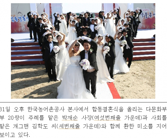 한국농어촌공사(사장 박재순)는 31일 경기 의왕시 본사 대운동장에서 결혼식을 미처 올리지 못한 다문화부부 20쌍을 초청해 합동결혼식을 올렸다.