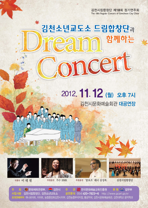김천시립합창단 지휘자(이태원)는 사회복귀를 준비하는 수형자들이 합창을 통해 아픔을 치유하고‘우리’라는 공동체 의식을 배워 세상과 소통할 수 있는 기회를 만들어 주기 위해 김천소년교도소 수형자들로 드림합창단을 구성했다. 이번 연주회에서는 드림합창단(지휘 이태원)이 지난 5월부터 40차례(120시간)에 거쳐 연습 한“거위의 꿈”,“사랑으로”등을 김천시립합창단과 함께 노래한다.