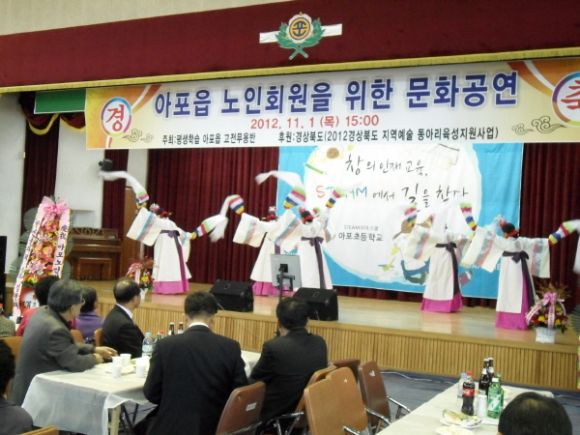 11월1일 오후 3시 아포초등학교강당에서 아포읍 고전무용반(이점령 외4)이 관내 노인회원을 대상으로 그동안 평생학습을 통해 익힌 고전무용 화관무, 장고춤, 흥춤 등 으로 문화공연을 펼쳐 참석한 주민들로부터 커다란 호응을 받았다.