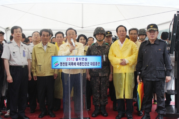 영천시(시장 김영석)는 지난 8월 20일부터 23일까지 전국적으로 시행된 2012을지연습에서 사전계획준비 및 사후조치, 국지도발 대응•전시전환 평가, 도상연습•실제훈련•전시종합상황실운영, 현안과제 토의•국민홍보 등 전 분야에서 우수한 성적을 받아 최우수 기관으로 선정되어 기관표창을 수상했다고 6일 밝혔다. 특히 8월 22일 14시부터 영천댐둑 및 보조댐에서 진행된 중앙통제단 평가에서 악천후에도 불구하고 김관용도지사, 이영우교육감 등 기관단체장과 일천오백여명의 시민이 참관한 가운데 30개 기관단체 300명이 실제훈련을 감동적으로 수행해 중통단 평가단으로부터 최고의 평가를 받았다.