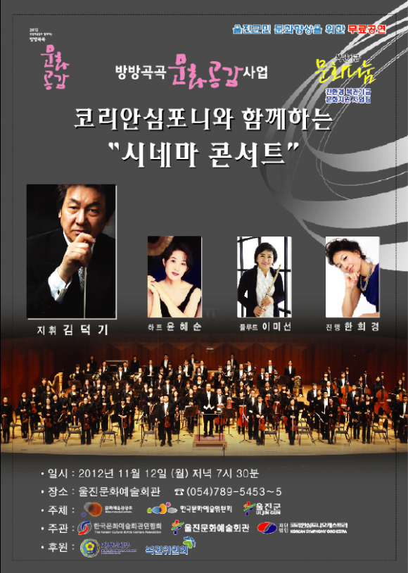 울진군(군수 임광원)은 깊어가는 가을밤 2012년 국립예술단과 함께하는 방방곡곡 문화공감 사업으로“코리안심포니와 함께하는 시네마 콘서트” 연주회를 11월 12일 저녁 7시30분에 울진문화예술회관에서 개최한다.