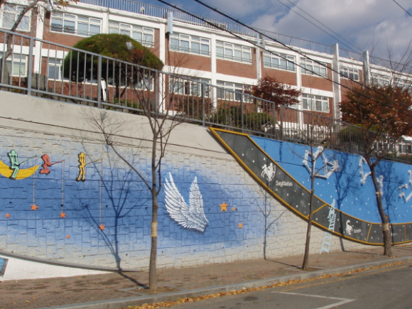 어둡고 삭막했던 학교 옹벽이 야간 경관조명과 벽화, 타일, 사인몰과 포토존이 있는 예술작품으로 변하면서 걷고싶은 주민 친화공간으로 탈바꿈했다.