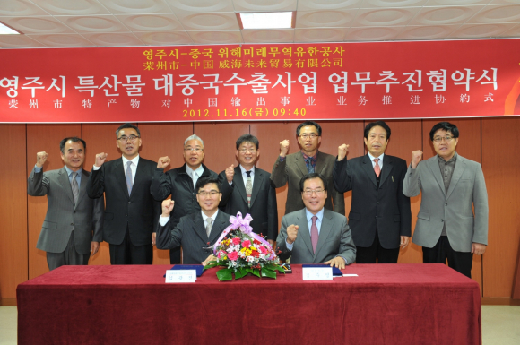 영주시는 11월 16일(금) 영주시청 제1회의실에서 중국 산둥성에 있는 위해미래무역유한공사와 영주시 특산물(홍삼제품 등)의 중국 수출을 위한 업무추진협약을 체결 했다. 이번 협약을 체결하기 위해 중국 위해미래무역유한공사 김광진 동사장 등 관계자 5명이 영주시를 방문했다.