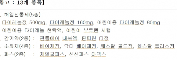 다만 타이레놀 160mg과 훼스탈골드정은 제약회사 포장공정과 생산라인 재정비로 12월이후 판매될 예정이다.