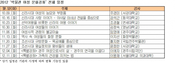 국립경주박물관(관장 이영훈)은 주부 등 일반 여성을 대상으로 11월 20일(화) ‘조선시대 규방문화-목공예를 중심으로(황지현 국립전주박물관 학예연구사)’를 주제로 박물관 여성 문화강좌-7를 진행했습니다.