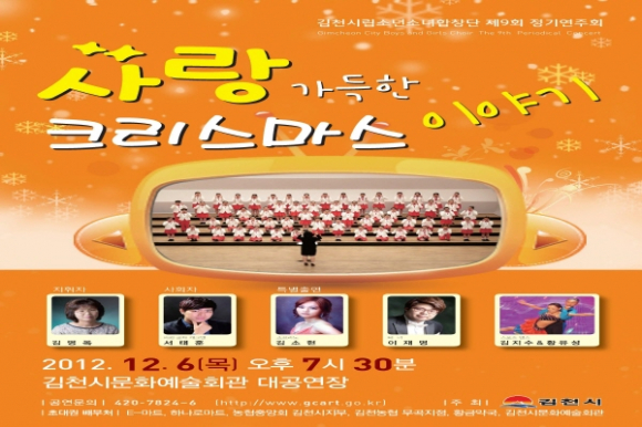김천시립소년소녀합창단(지휘자 김명옥)은 12월 6일(목) 오후 7시 30분 김천시문화예술회관에서 제9회 정기연주회「사랑 가득한 크리스마스 이야기」를 공연한다.