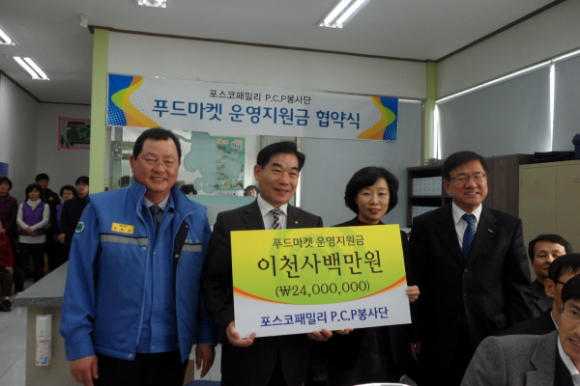 포스코PCP봉사단은 푸드마켓이 어려운 이웃들의 생활안정에 큰 희망을 주고 있음을 공감하고 지속적인 기부나눔 문화 확대를 위해 올해도 어김없이 월200만원씩 1년간 2,400만원을 후원키로 협약하는 ‘작은나눔 큰 실천’ 행사를 가졌다.