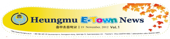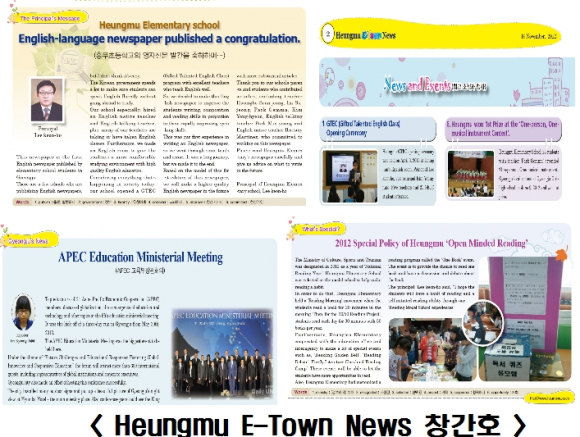 지역 내 초등학교에서는 최초로 창간된 영자신문은 본교 영어영재반 5∼6학년생 중심으로 영재학급 리포터 8명, 다문화가정 학생, 저학년생 등 영자신문 발행에 참여하고자 희망한 모든 재학생들이 참여해 원어민 교사, 영어 담당교사의 지도로 수 차례의 편집회의, 원고 수정 등을 통해 Heungmu E-Town News를 창간케 되었다.