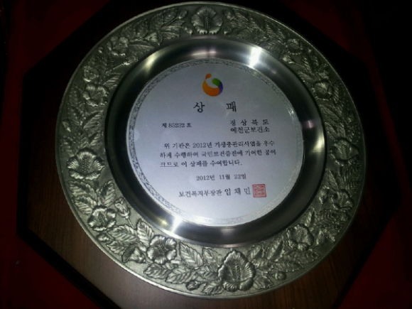예천군보건소는 22일 대구 인터불고에서 개최된 2012년 기생충퇴치사업 성과보고회에서 전국 우수 기관으로 선정돼 보건복지부장관 기관 표창을 수상했다.
