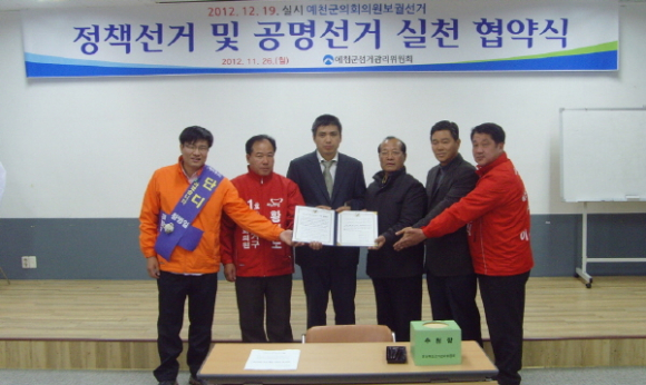 예천군선거관리위원회(위원장 이상헌)는 11월 26일(월) 오후 6시 30분 예천군선거관리위원회 2층 회의실에서 예천군의회의원 보궐선거의 후보자 등록을 마친 새누리당 황재도, 이형식 후보와 무소속 황병일, 이태현, 정운오 후보가 참석한 가운데 정책선거 및 공명선거 실천 협약을 맺고 이번 선거를 정책경쟁을 통한 깨끗한 선거로 치를 것을 다짐했다고 밝혔다.
