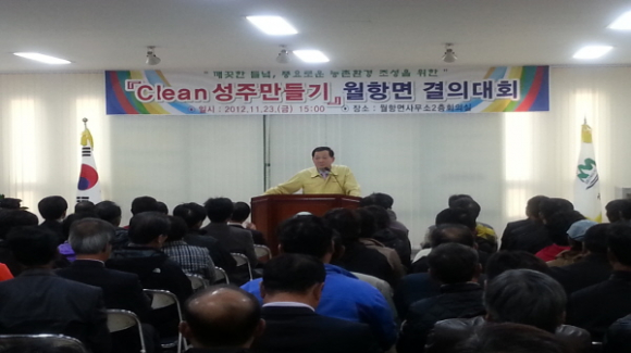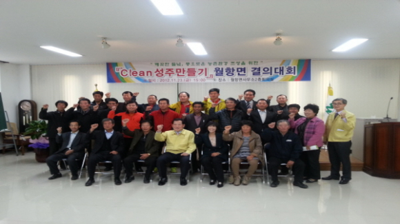 역사와 전통이 살아 숨쉬는 월항면(면장 최종관)은 11월 23일(금) 오후 3시에 면사무소 회의실에서 김항곤 성주군수를 비롯한 기관단체장, 환경지도자, 이장, 새마을지도자 등 150여명이 참석한 가운데 『깨끗한 들녘, Clean 성주 만들기』 결의대회를 개최했다.