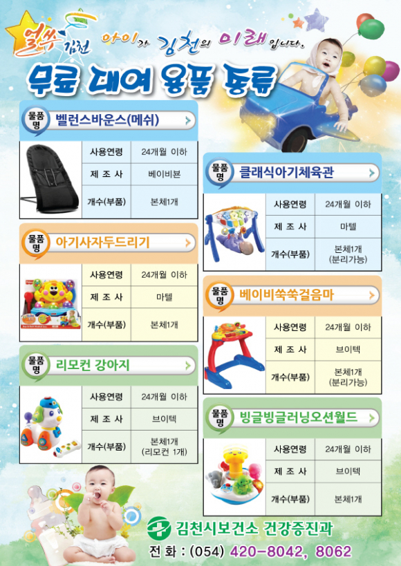 육아에 필요한 용품을 구입해 보건소에 비치하고 일정 기간을 정해 무료로 대여하는 사업이며 현재 베이비바운스 외 5종 110개를 구비하고 대여 사업을 시작하고 있다.