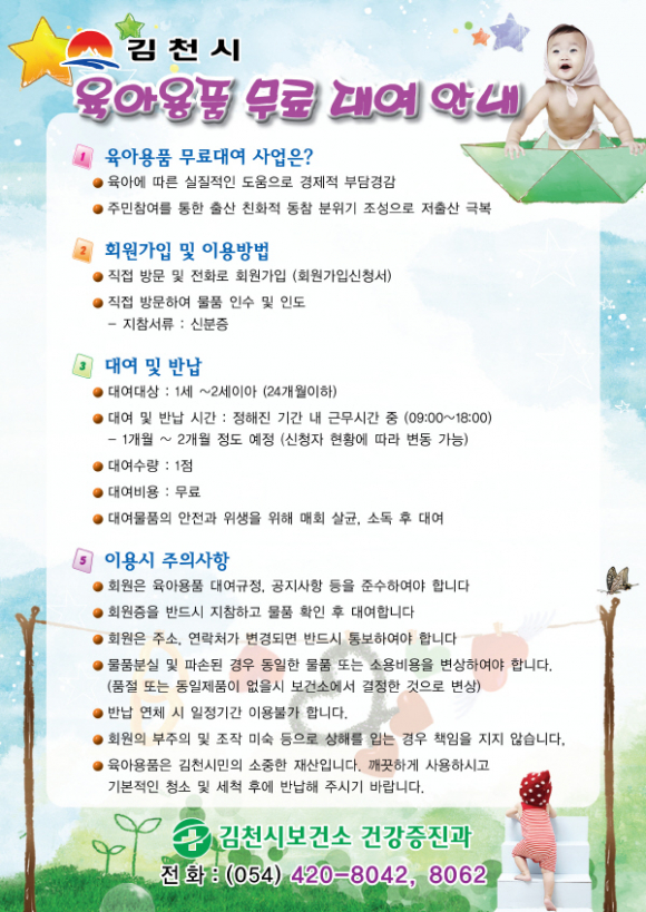 김천시는 출산가정의 경제적 부담을 경감하기 위해 육아용품 무료 대여 사업을 원활하게 실시하기 위해 우선적으로 11월26일부터 11월30일까지 1차 회원을 모집하고 있으며