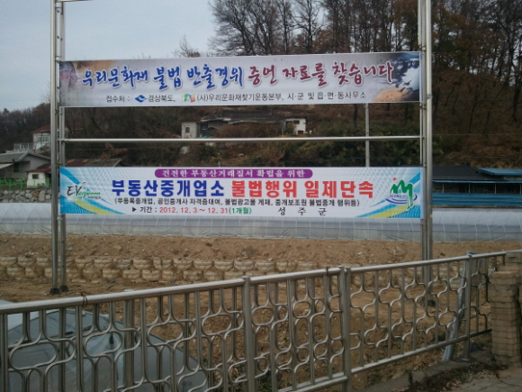 성주군(군수 김항곤)은 부동산중개사무소 36개소를 대상으로 2012년 12월 3일부터 12월 31일까지 한달 동안 관내 부동산중개업소를 집중단속할 예정이다 |  | | | ⓒ GBN 경북방송 | |