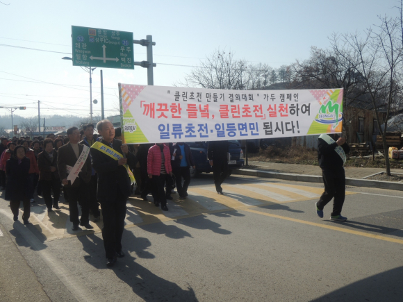 1팀은 미리 배부해 준 어깨띠, 현수막, 피켓 등을 착용하고 면사무소를 출발 초전우체국, 초전보건지소, 초전초등학교를 경유해 면사무소로 귀청하며 가두행진을 펼쳤고, 2팀은 문덕천 일원에서 수해쓰레기 및 폐비닐 수거 등의 정화활동을 펼치며『Clean 초전만들기』의 상쾌한 출발을 알렸다. |