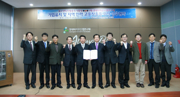 경북바이오산업연구원은 28일 대회의실에서 대구경북지방중소기업청과 지역 기업 맞춤형 인재양성과 기업 유치를 위해 업무 협약(MOU)을 체결했다.