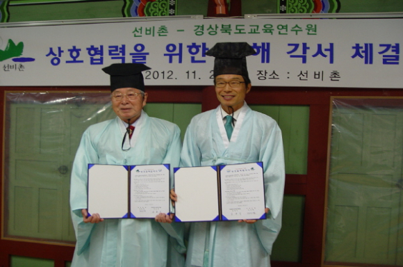 |  | | | ⓒ GBN 경북방송 | | 이번 양해각서는 경상북도 교육연수원에서 진행되는 교원연수프로그램에 영주 선비촌의 전통문화체험 프로그램을 접목하기 위한 것으로 지역사회 발전과 교육 및 연구 활동에 기여할 수 있는 협력사업으로 추진되었으며 양 기관의 교육연수체제 구축, 교원연수 프로그램 공동개발 및 자문, 기관 시설물 이용시 상호 사전 협의 등의 내용으로 이루어져 있다.