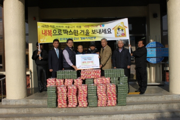 한국농어촌공사 경북지역본부(본부장 김용수)와 경주지사(지사장 차한우)는 28일 경주시 산내면(면장 김문일)에 홀몸어르신들을 위해 조성한 내복펀드로 구입한 내복200벌을 전달하는 행사를 가졌다.
